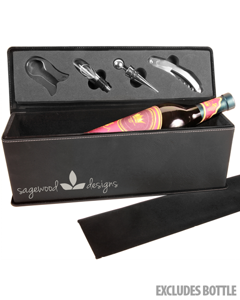 Leatherette offers the look and feel of genuine leather at a fraction of the price. The richly textured high quality workmanship of each leatherette piece is sure to impress every recipient with its elegant individuality.Holds1 bottle. We can engrave any logo, message or design in silver on this box FREE. Gift Box includes decanting pourer, stopper, corkscrew and plastic foil cutter. The corkscrew has a fold out knife, bottle opener and boot lever. The box has a magnetic closure. 14 x 4 ¼ x 4 ½