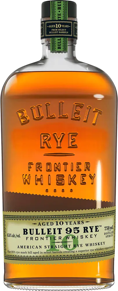 "Using the same mash bill as the classic Bulleit Rye, this 95% rye and 5% malted barley whiskey is a balance of smoothness and spice. Aged to perfection for no less than 10 years, the pear-like fruitiness, dry, buttery oakiness and faintly spiced notes are best served neat or on the rocks." Distiller's Notes