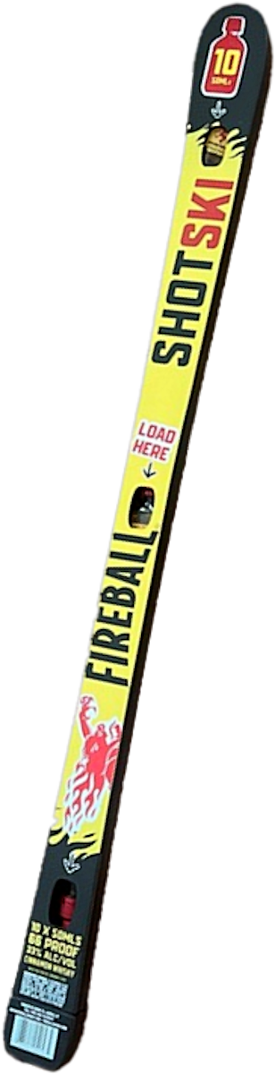 "The Fireball shotski comes pre-loaded with 10 x 50ml bottles of Fireball Cinnamon Whisky. Three friends, one ski, zero hesitation."