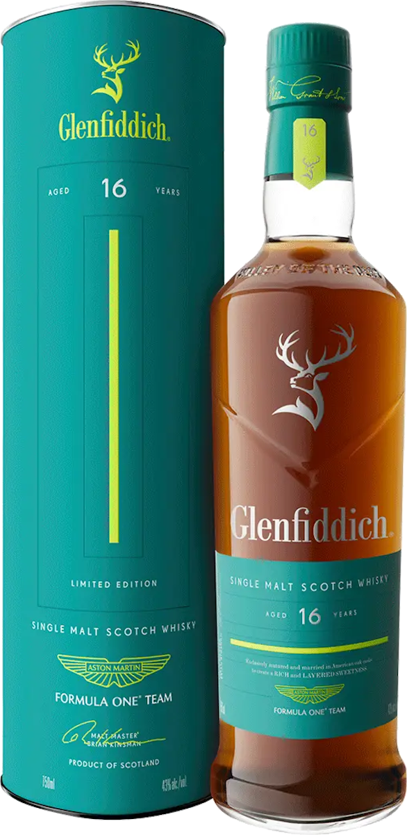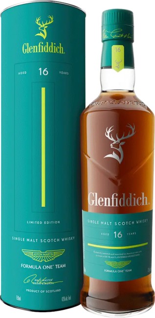 "The Glenfiddich limited-edition 16 Year Old is inspired by our partnership with Aston martin Formula One Team. Formed through a marriage of American oak wine casks, new American barrels and second-fill bourbon casks. Rich notes of maple syrup and carmelized ginger give way to a silky palate of fresh fruit and Chantilly cream. Its finish is smooth, yet bold and distinct, exuding a quality that escapes the ability to be measured." Tasting Notes